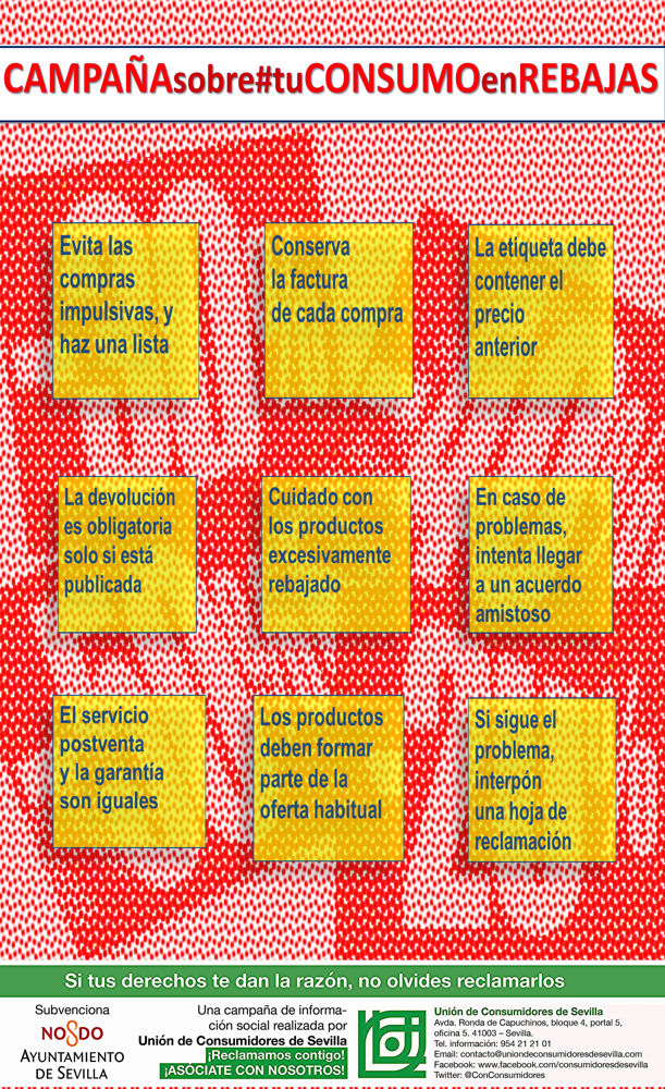 Ya han empezado las rebajas de Verano y mediante esta campaña informativa la Unión de Consumidores de Sevilla ofrece una serie de consejos para que sus compras en “Rebajas” se realicen siempre con las máximas garantías. Especialmente en estas rebajas ...