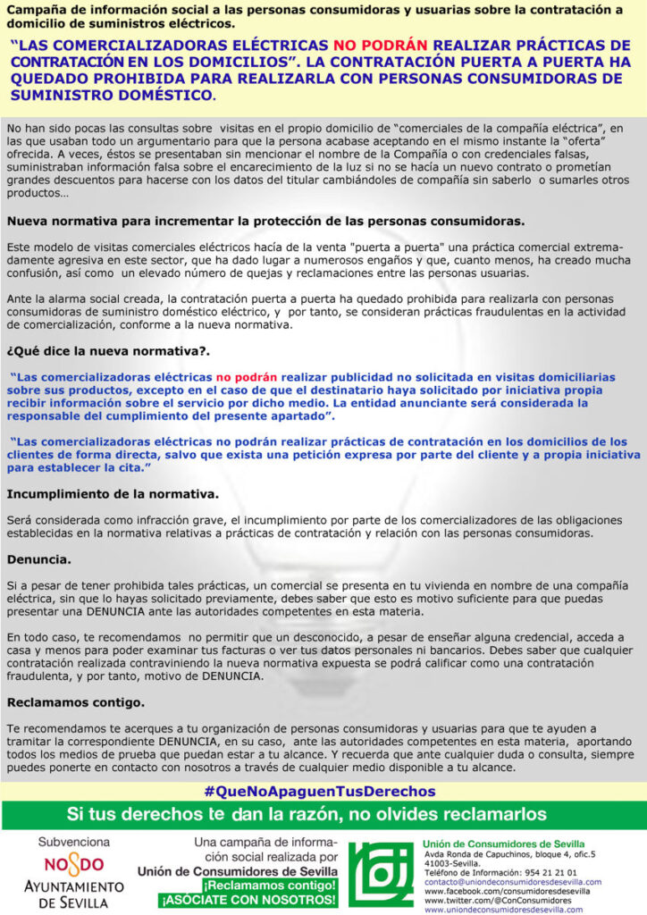 Nueva normativa para incrementar la protección de las personas consumidoras. “Las comercializadoras eléctricas no podrán realizar prácticas de contratación en los domicilios”. La contratación puerta a puerta ha quedado prohibida para realizarla con personas consumidoras de suministro doméstico.