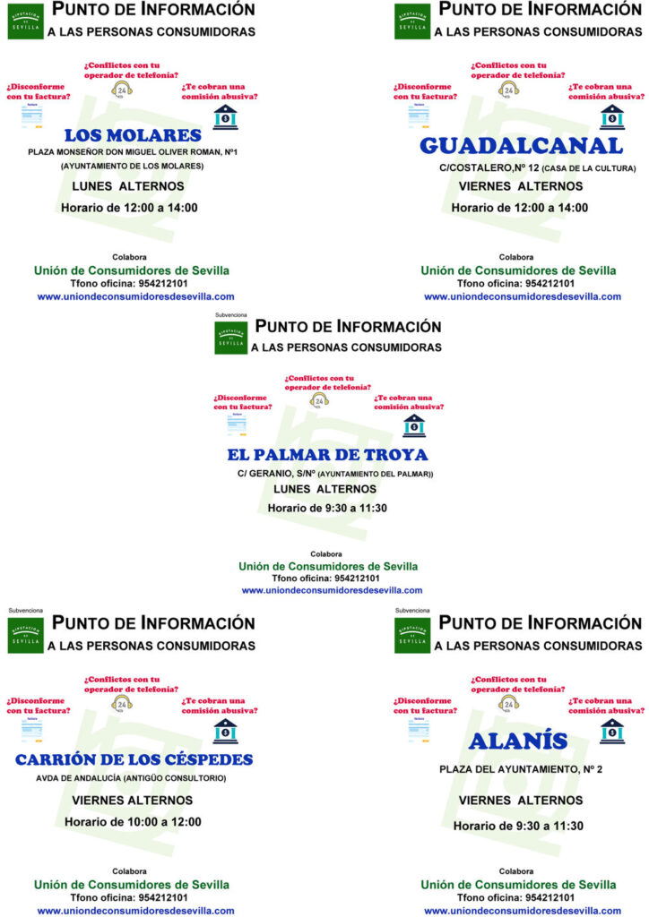 En este Punto de Información de la UNIÓN DE CONSUMIDORES DE SEVILLA- UCS te podrán informar y asesorar sobre cómo ejercer tus derechos, así como de las diferentes vías de reclamación para la defensa de tus derechos como persona consumidora y usuaria. Asimismo, y en caso que lo requieras, podemos tramitar tu Hoja Oficial de Quejas y Reclamaciones de la Junta de Andalucía a los organismos competentes según la materia.
