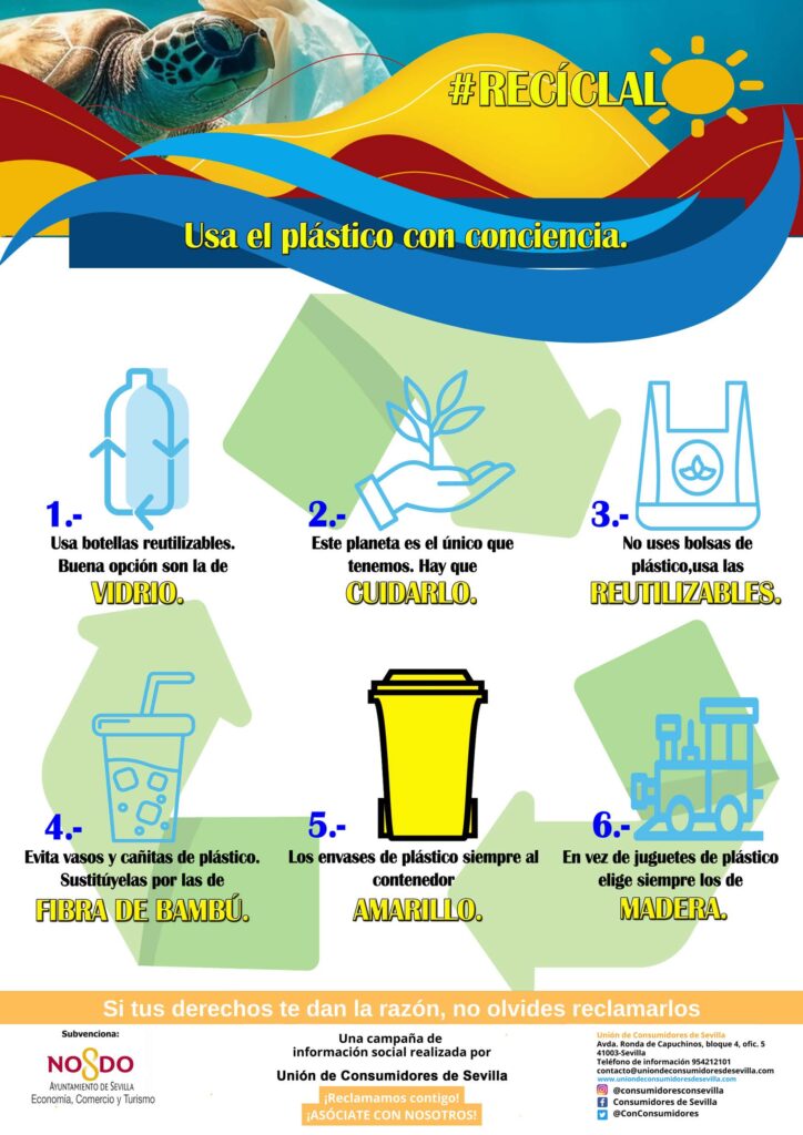 Unión de Consumidores de Sevilla vuelve a insistir, nuevamente en este año, en esta campaña ya que desgraciadamente el plástico sigue inundando nuestras vidas mediante envases, bolsas, botellas, etc., los cuales se siguen usando de forma desmedida con unas consecuencias medioambientales cada día más graves.